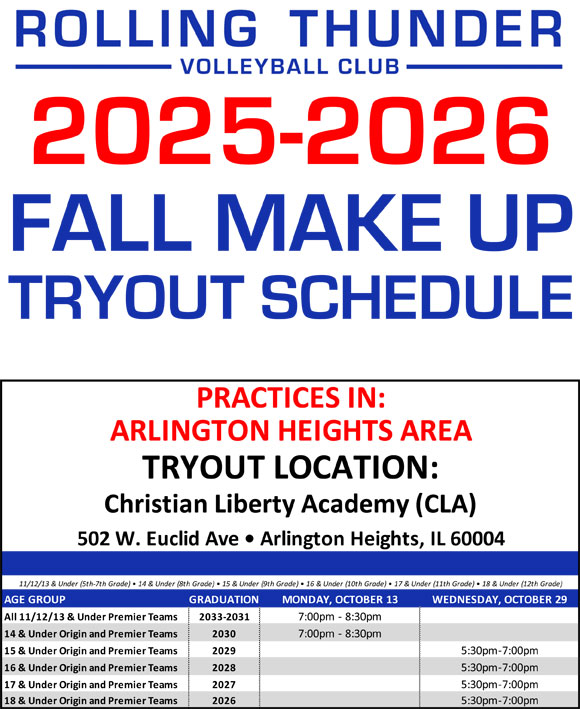 Step 1: Register on this page for Rolling Thunder Volleyball Club Tryouts.